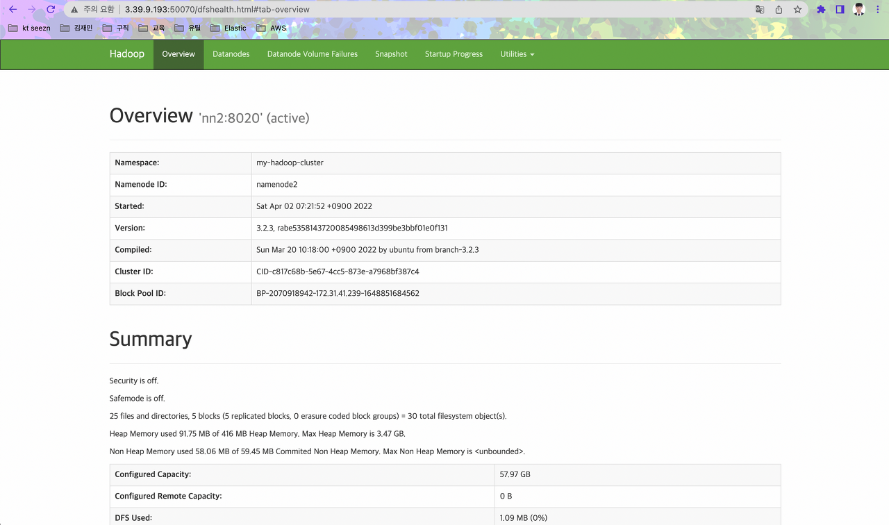 3. nn2 서버 Hadoop WEB UI 확인 : http://[nn2서버 Public IP]:50070